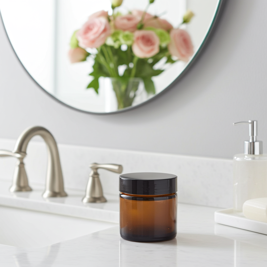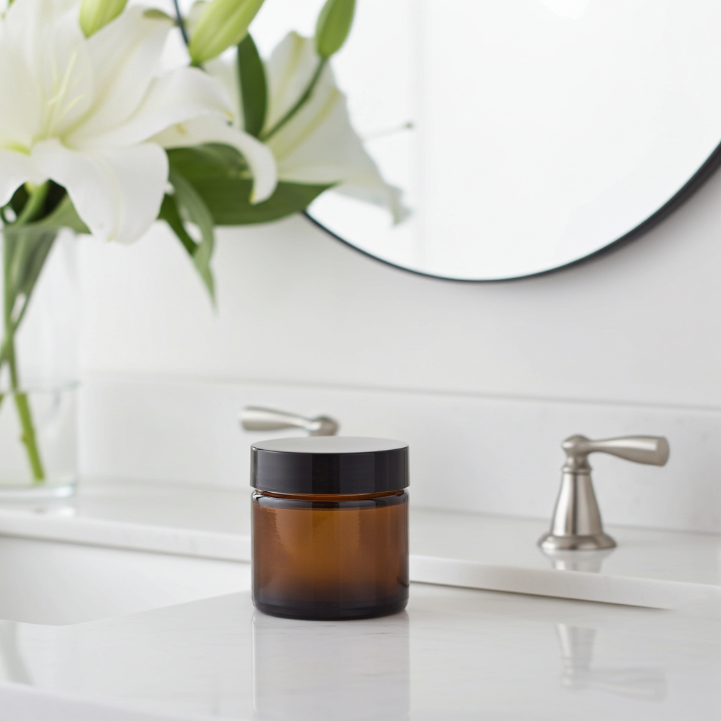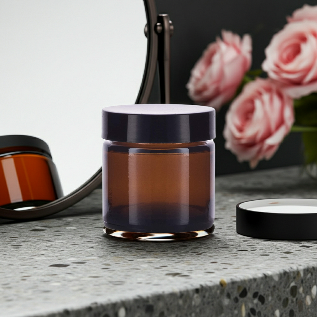 1 oz Amber Glass Straight Sided Jar with Black Smooth Lids (12 Pack)