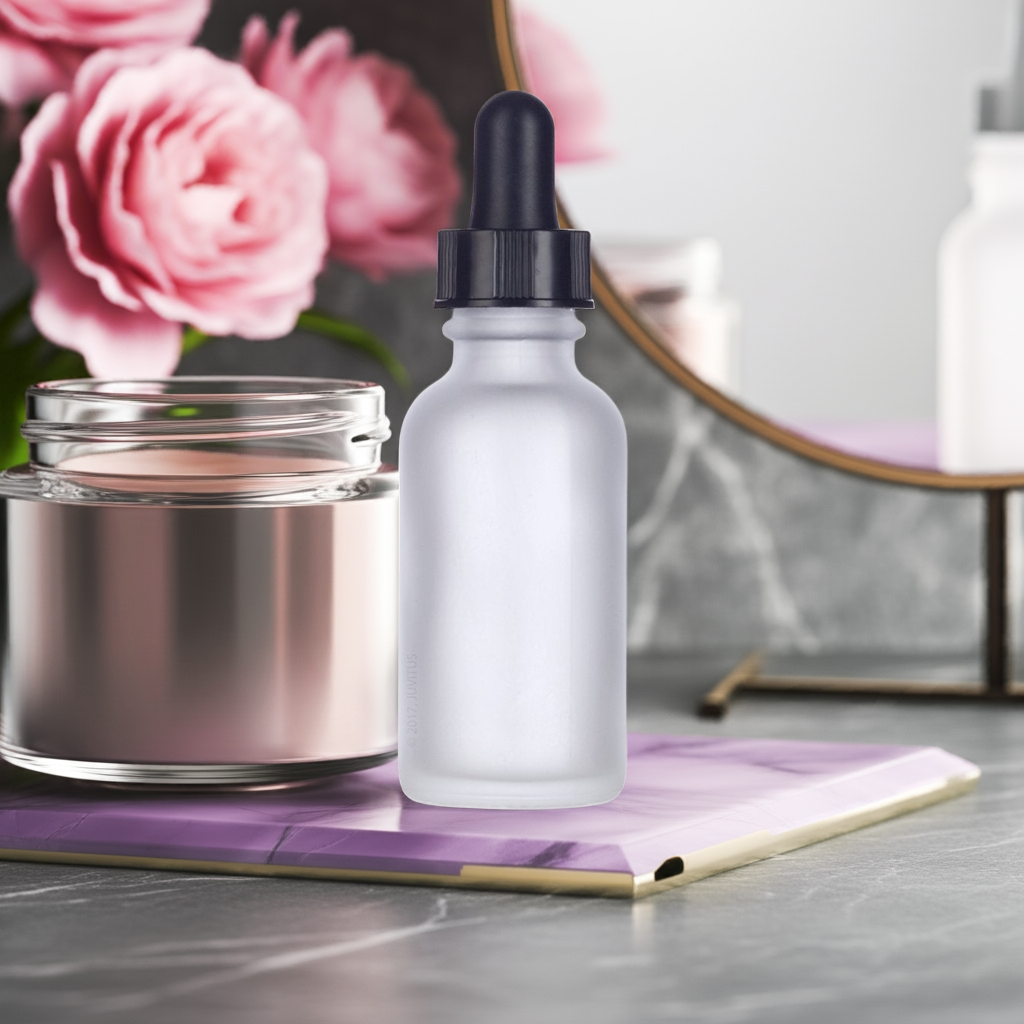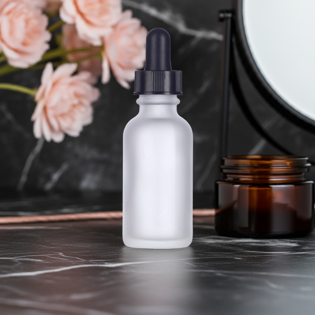 Frosted Clear Glass Boston Round Bottle with Black Dropper (12 Pack)