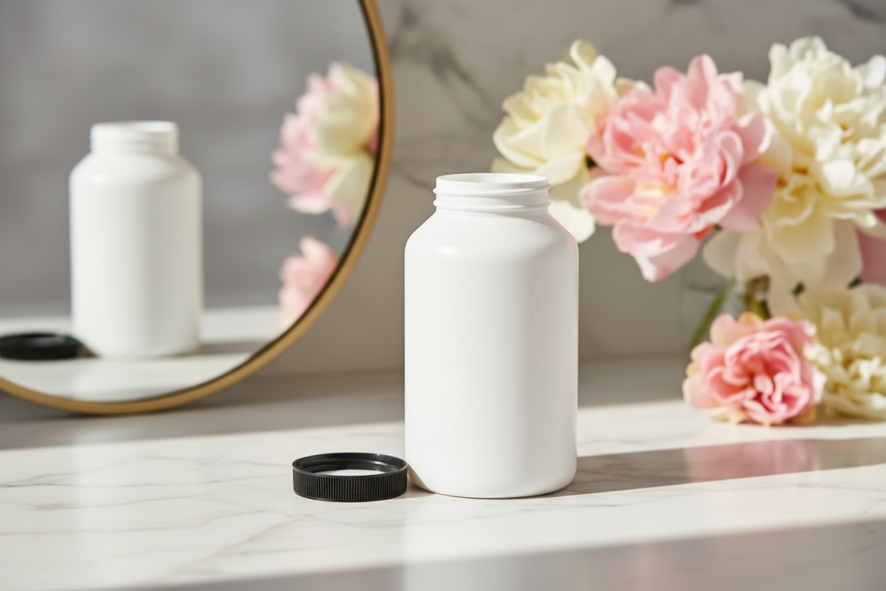 (6 pack) 17 oz White HDPE Plastic Packer Bottle with Black Ribbed Lid