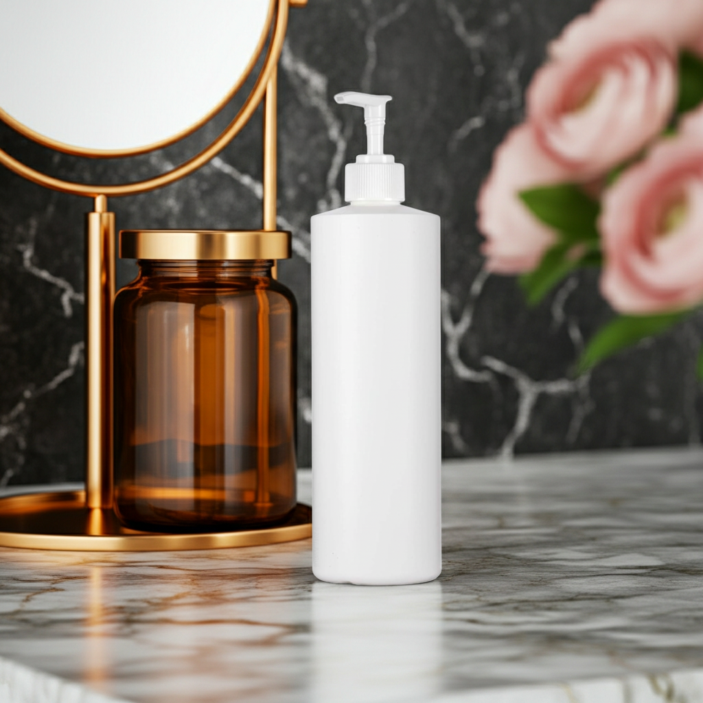 White HDPE plastic cylinder squeeze bottles with lotion pump closures. Durable and practically unbreakable.