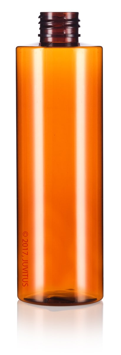 8 oz / 250 ml Amber PET plastic cylinder bottles with wide symmetrical black smooth disc caps.