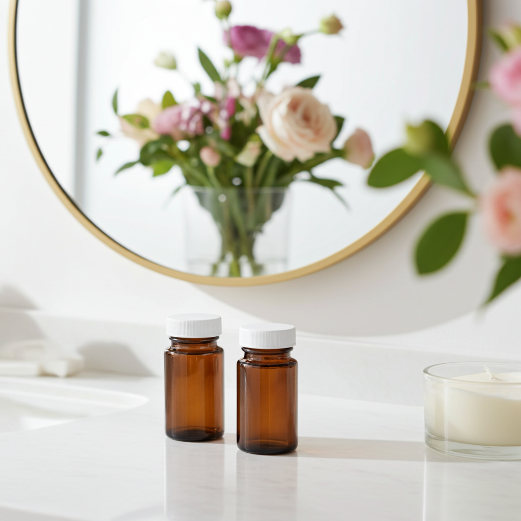 2.5 oz Amber Glass Packer Bottle with White Lid (12 Pack)
